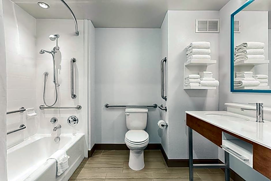Any corresponding photo may not reflect the specific accessible room type or room feature. This mobility and hearing accessible, nonsmoking room features one king sized bed , and an accessible bath tub. The room also has a visual alarm and notification devices for the doorbell or door knock and incoming phone calls. The room features comfortable soft seating, microwave, refrigerator, a HDTV, and easy to operate alarm clock/radio. The free high speed internet access will help you stay connected while on the road. If you prefer not to work at the desk, you can use the convenient lapdesk instead. You'll also enjoy the convenience of having a coffee maker with tea service and iron/ironing board in your room.